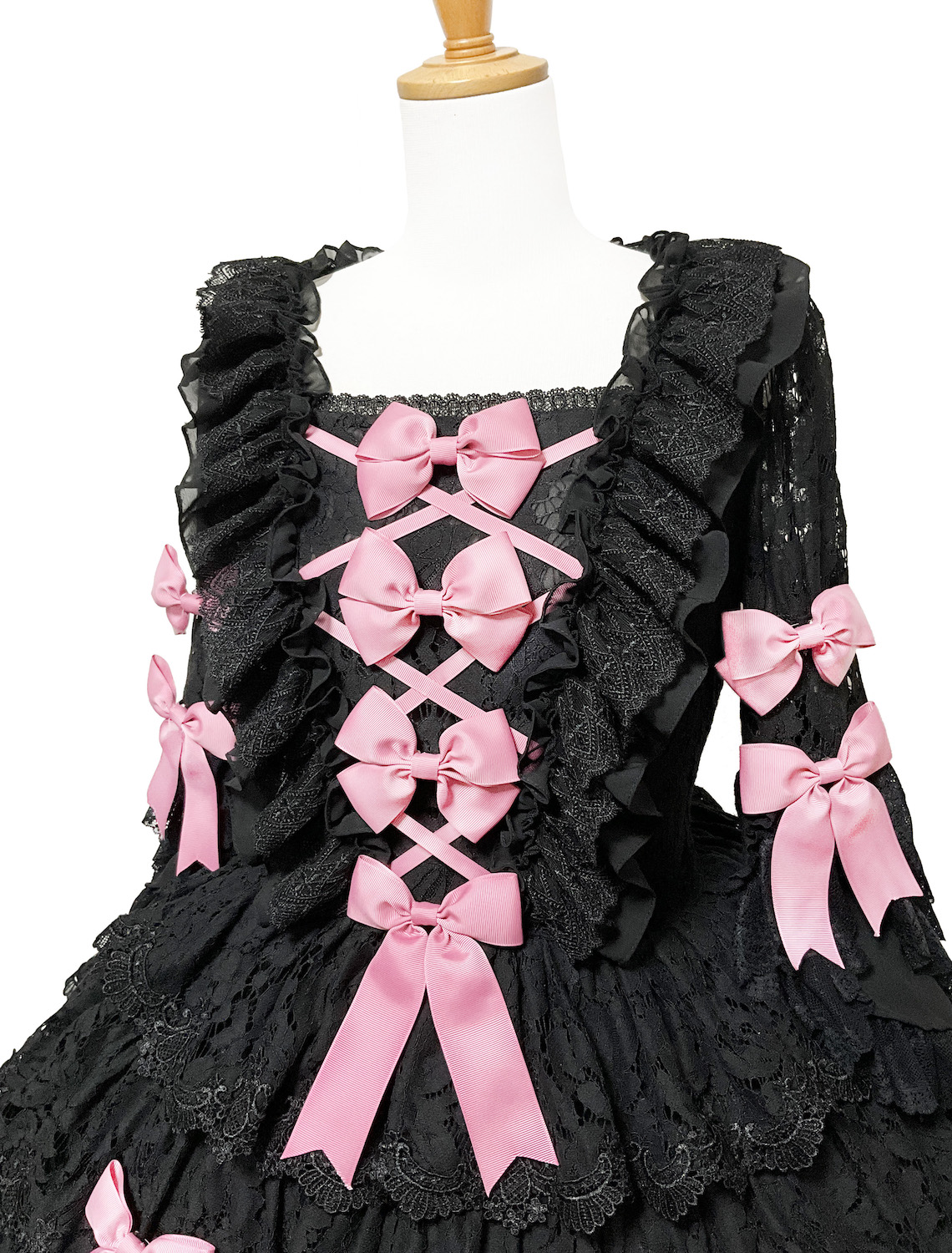 | 特徴 | 贅沢な総レースドレス ゴシック感満載の全黒ベース リボン(全部取り外せる)もいっぱいで可愛い 落ち感素材の美しい魅力 高級感のあるシフォン裏地 |